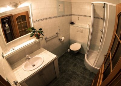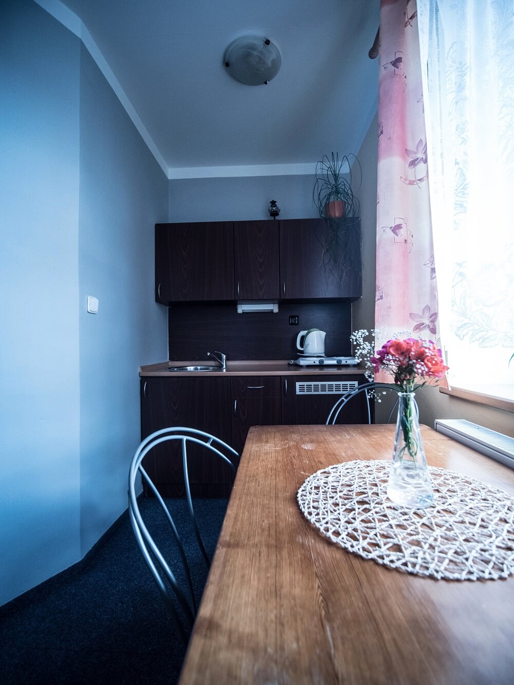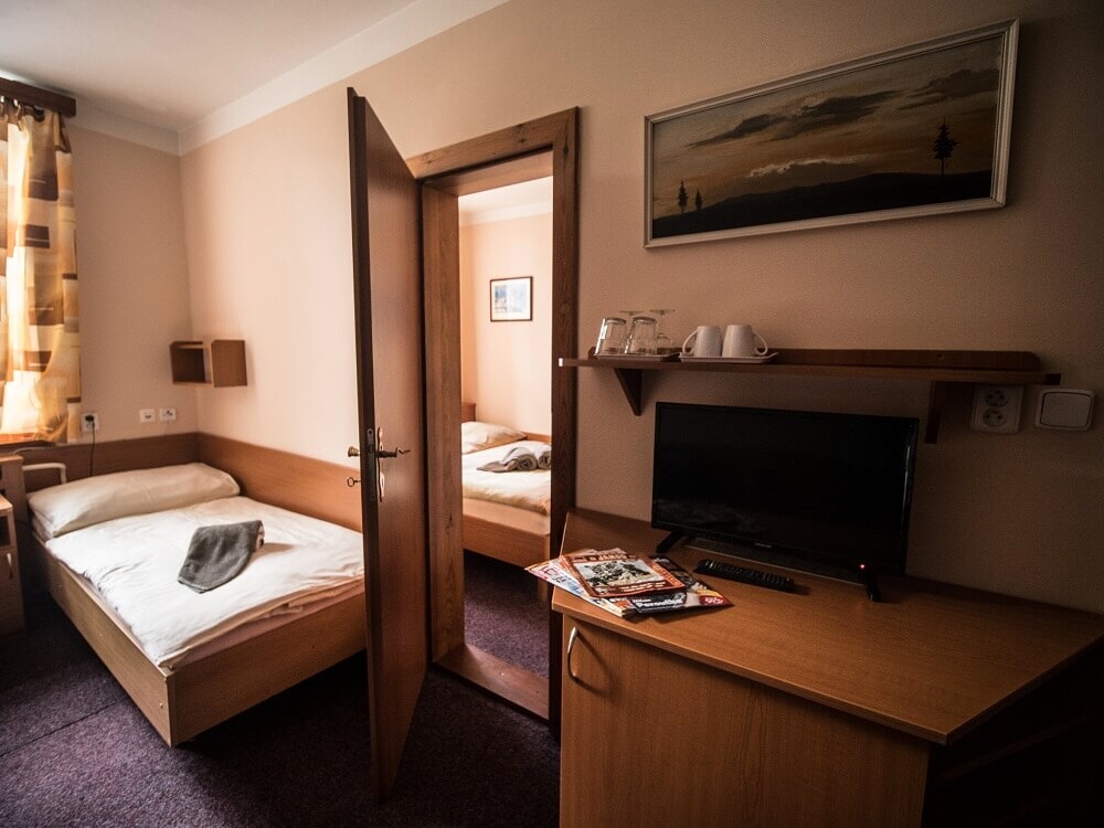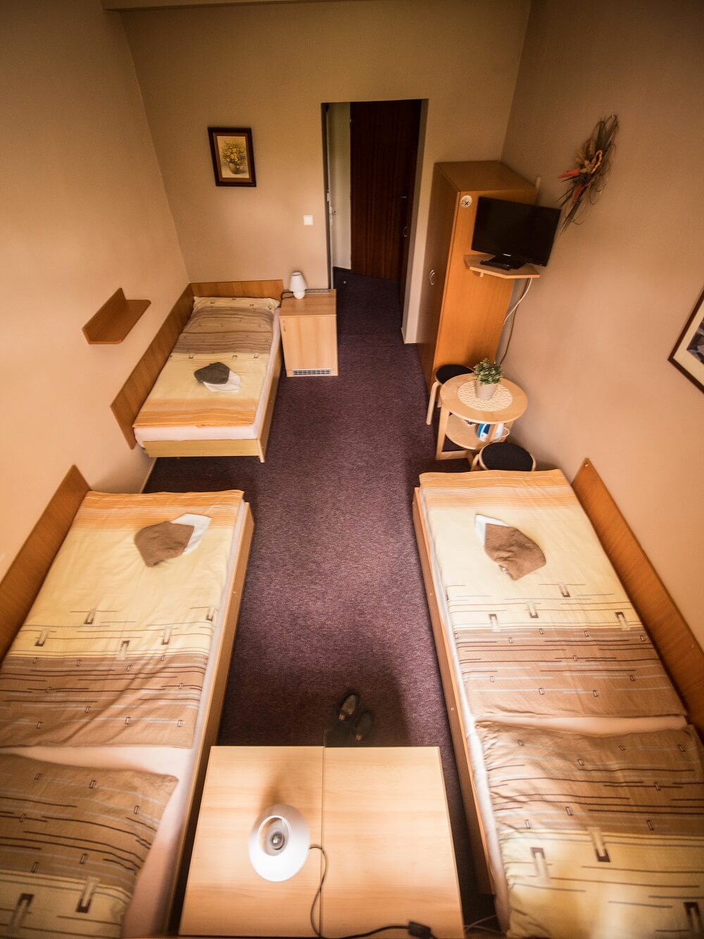 Vybavení standardního pokoje zahrnuje TV, internetovou přípojku, lůžkoviny, mýdlo, ručníky, koupelnu se sprchovým koutem a WC.